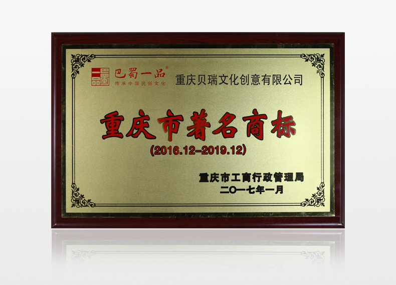 重庆市著名商标由重庆市工商行政管理局公开评审,入选条件十分严苛。此次获评著名商标,不仅对「巴蜀一品」做出了表彰,更是对企业综合实力的肯定。这是继2012年「贝瑞文化」获著名商标之后,企业获得的第二个“著名商标”!