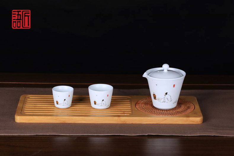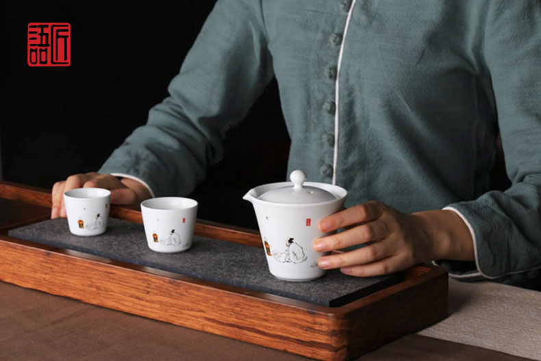 巴蜀一品推出的匠语·煮茶图快客杯,更具快客杯便携优势,非常适合现代都市人快节奏的生活和出行需要。器形简洁大方、大小比例设计适中,拿握轻便;杯身图案特邀工艺美术大师王贵明手绘原稿,加上影青哑光釉,温润典雅,燃炉煮茶画面栩栩如生,已获国家级外观设计专利。