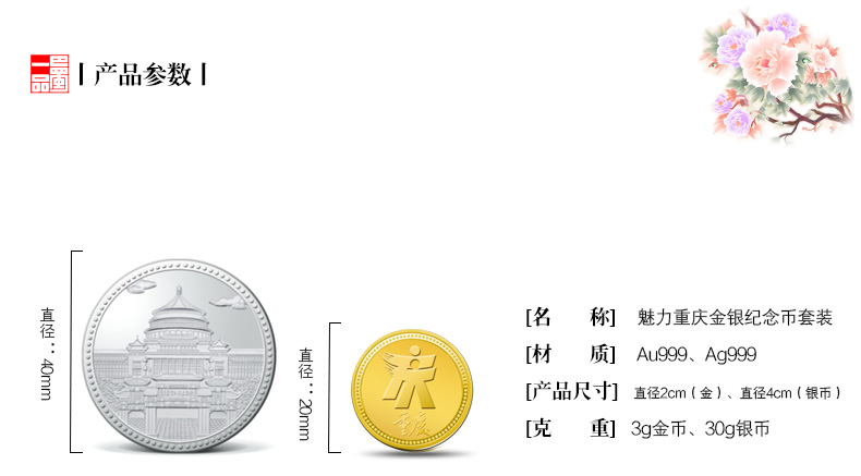- 商品规格 金币直径2cm,克重3g; 银币直径4cm,克重30g.
