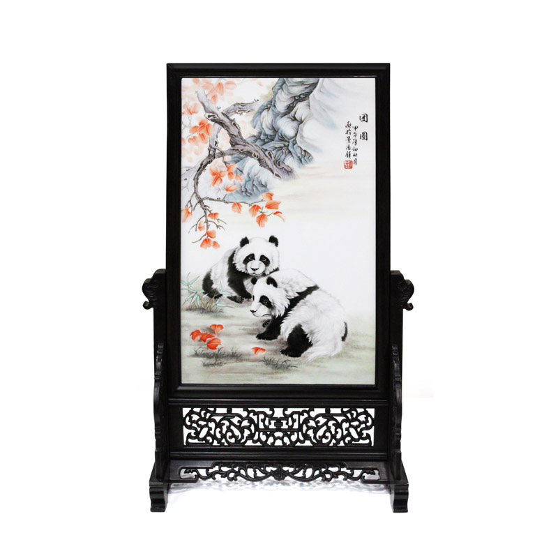 【产品名称】团圆瓷板台屏 【产品规格】整体规格:665*380*190mm 内框规格:470*290mm 【产品简介】熊猫是中国乃至世界稀有的“活化石”,我国政府曾将两只取名“团圆”的大熊猫赠予宝岛台湾,寓意吉祥、美满。本品选自景德镇精品陶瓷,由景德镇高级画师亲手绘制,熊猫在枫叶下憨态可掬、栩栩如生。外框选用名贵木材紫光檀,高端大气。本品兼具了欣赏价值与收藏价值,是个人收藏、高端礼赠中的精品。 【产品展示】 ![]() |
