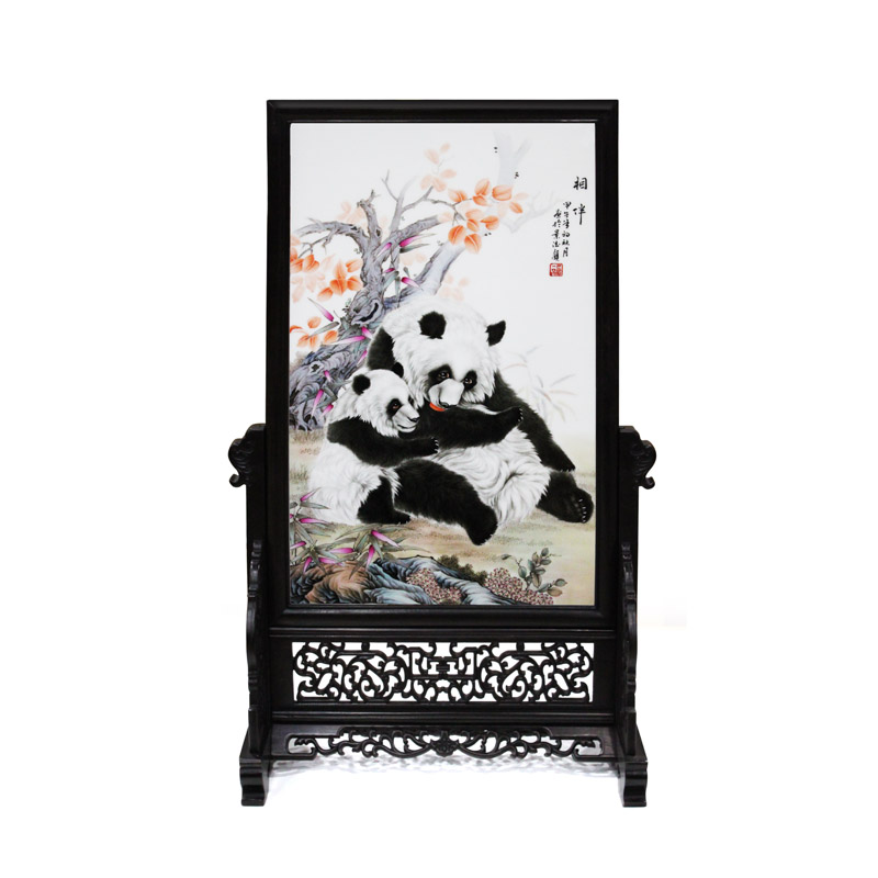【产品名称】相伴瓷板台屏 【产品规格】整体规格:665*380*190mm 内框规格:470*290mm 【产品简介】熊猫是中国乃至世界稀有的“活化石”,本品取材于枫叶下相互依偎的熊猫母子,母子之间相伴的亲昵之态让人顿生暖意,温馨不已。本品选自景德镇精品陶瓷,由景德镇高级画师亲手绘制,熊猫在枫叶下亲密相伴、温馨感人。外框选用名贵木材紫光檀,高端大气。本品兼具了欣赏价值与收藏价值,是个人收藏、高端礼赠中的精品。 【产品展示】 ![]() |