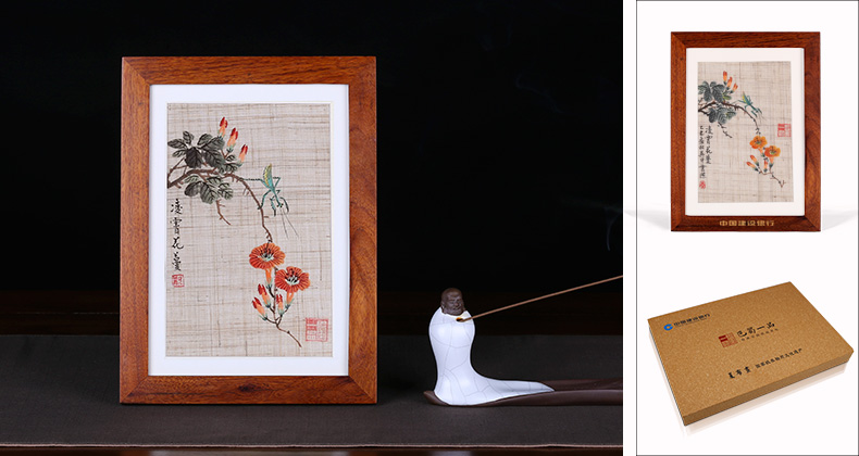 绿蔓如藤不用栽,淡青花绕竹篱开。披衣向晓还堪爱,忽见螳螂带露来。 花与昆虫,一静一动,趣味顿生。本品选用150目原生态夏布,由巴蜀一品特约画师唐云杰作画秉承齐白石一派的简约写意,红艳的花蔓在古朴的夏布上更添情致。高档实木边框,便携小巧,在边框下方及包装盒上定制企业信息,简约美观,专属性强。